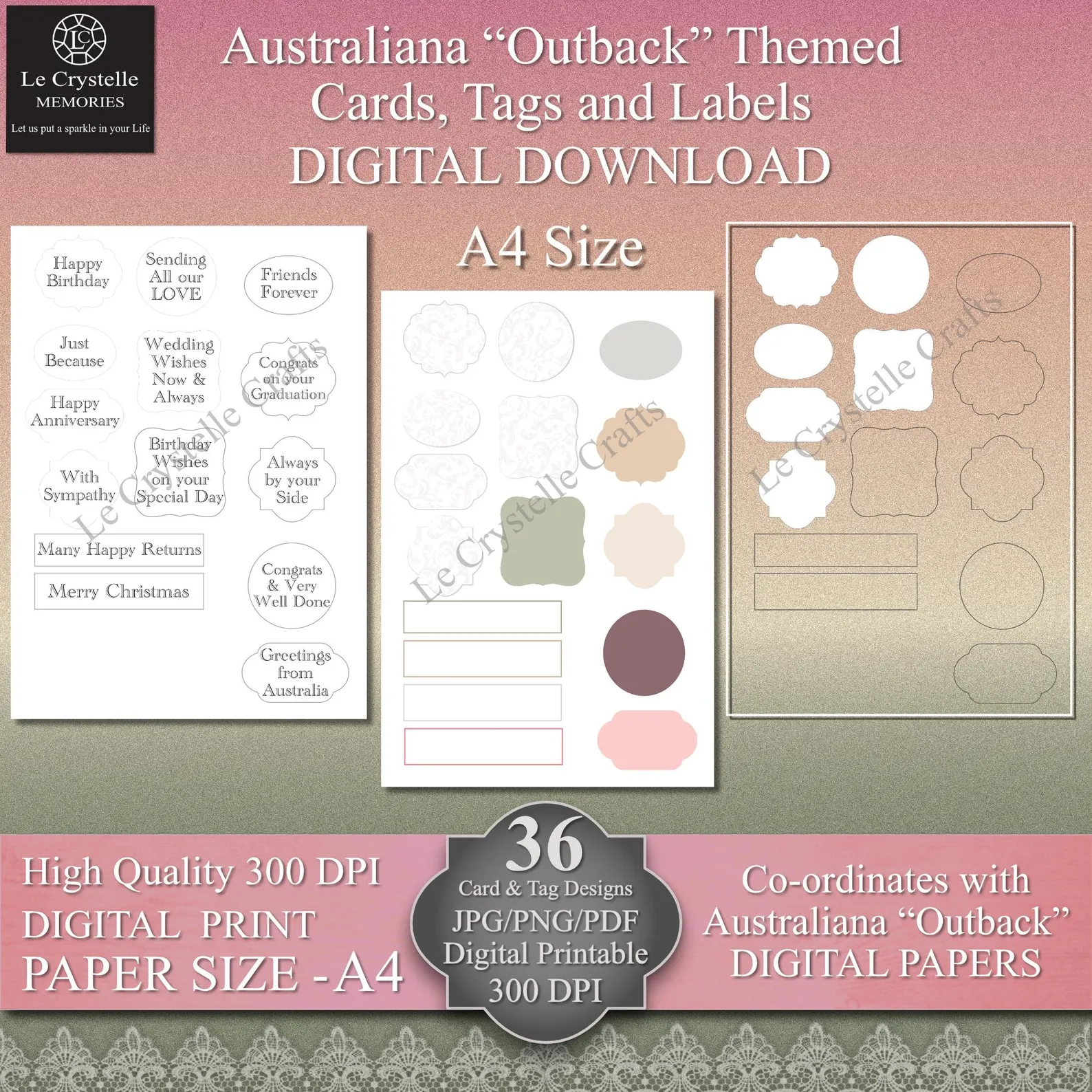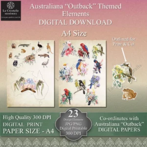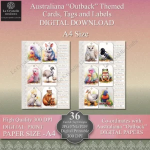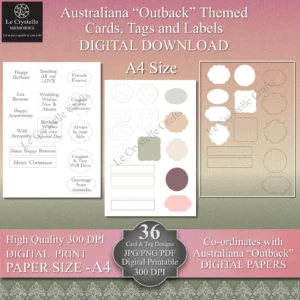 Elevate your crafting projects with this versatile collection of 12 Cards toppers, 12 quick Cards, 12 tags and sentiments, Various combination of Labels and 23 design elements all coordinating on A4 design sheets, specifically created to complement our Australian Outback Digital Paper Collection (sold separately). See our other listings for the Australian Outback paper design collection in both 12×12 Size and A4 size