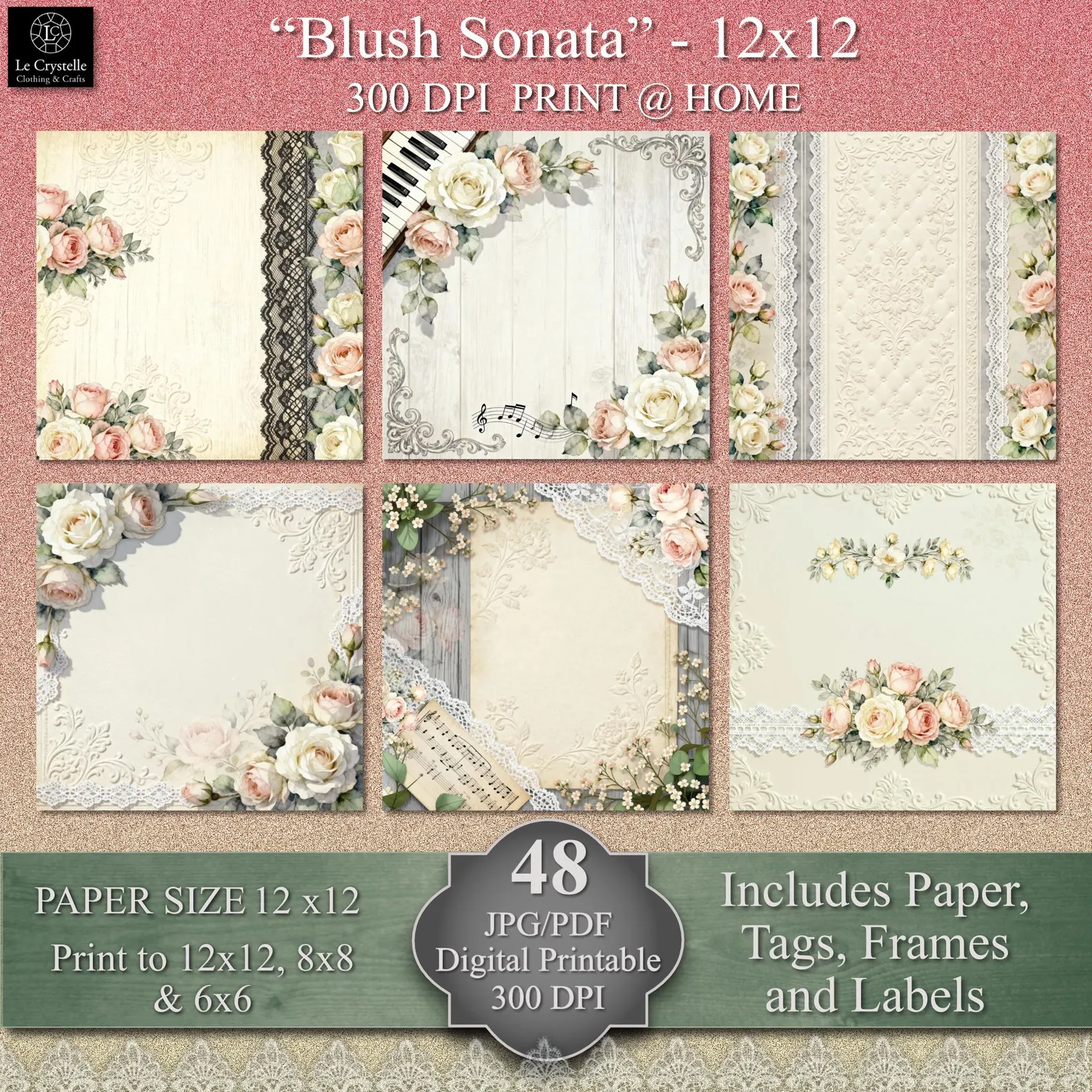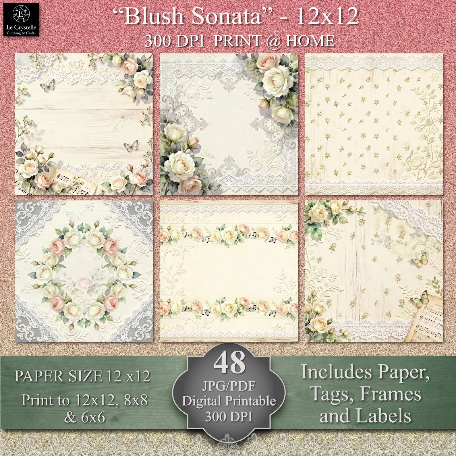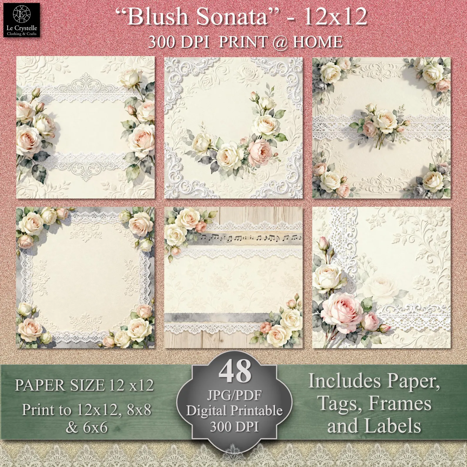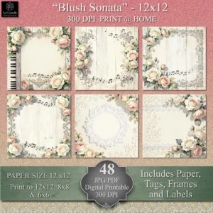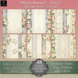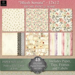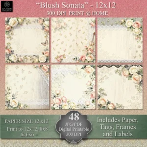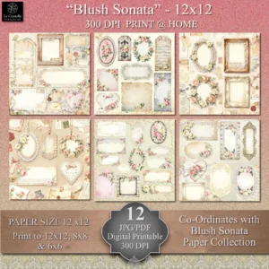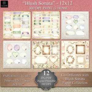 Elevate your crafting projects with this versatile collection of 48 coordinating Digital 12×12 designs, plus Blush Sonata Extras. These 12×12 papers can be printed to 8×8 and 6×6 size. You need to know how to adjust your printer settings for the different size print outs.