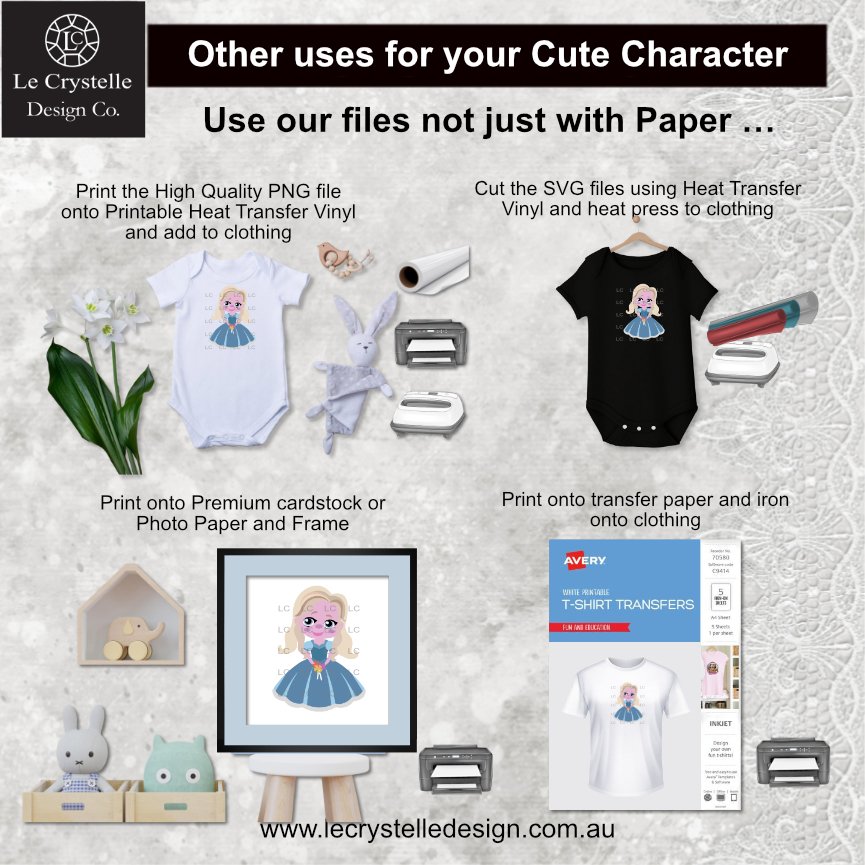 But don’t limit yourself to just paper, our cute characters can be used with printable vinyl, heat transfer vinyl, sticky back vinyl, transfer paper or print the High Quality 300 DPI PNG files and add to a photo or wall frame to decorate a nursery or room. You could even add the sticky back vinyl cute character to a cup! There are just so many ways to use our cute character files.