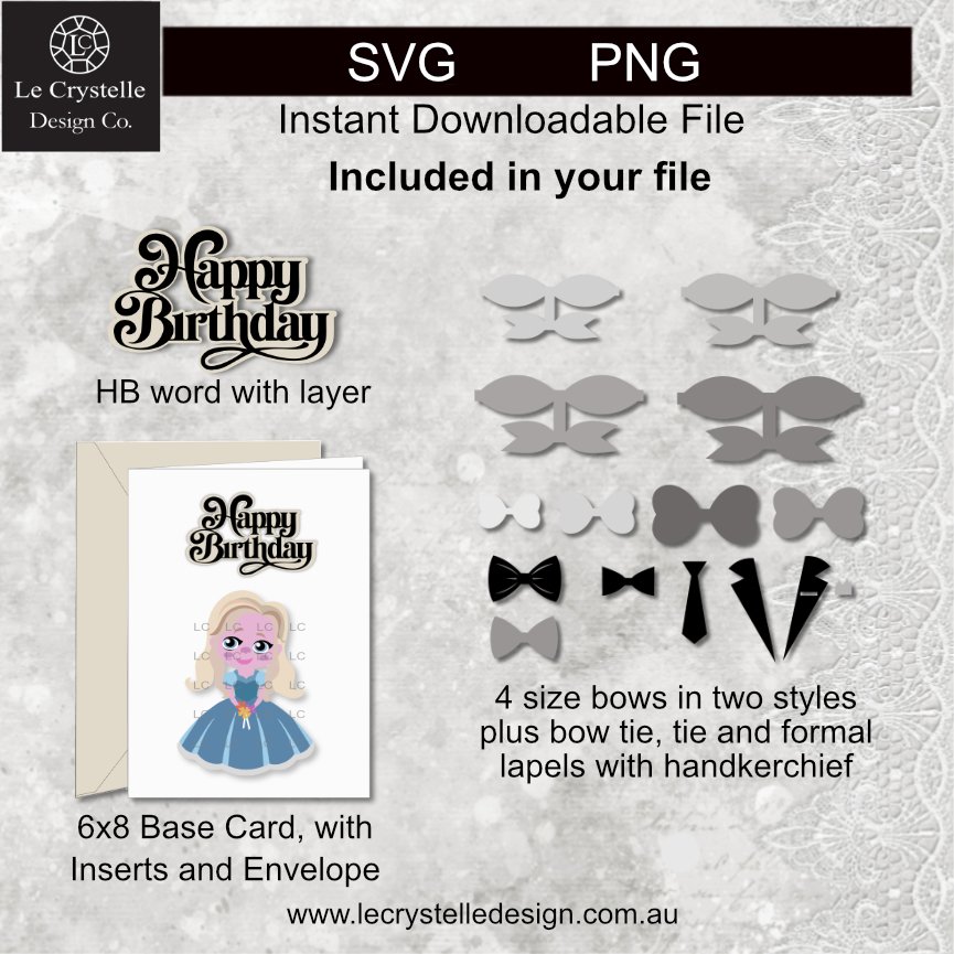 Your box card cut file is not only for the Lrg, Med and Sml explosion boxes and small top closed box with lid but you also receive files for embellishing such as frames, square layers, 2 x Style pockets with layers all in lrg med and sml sizes. PLUS you will receive files to make a 6×8 card with inserts and envelope together with a svg text word of Happy Birthday with a contoured background layer so you can choose to add your cute character not only to an explosion box but also to the front of a special card. The recipient will think you are amazing and very clever!