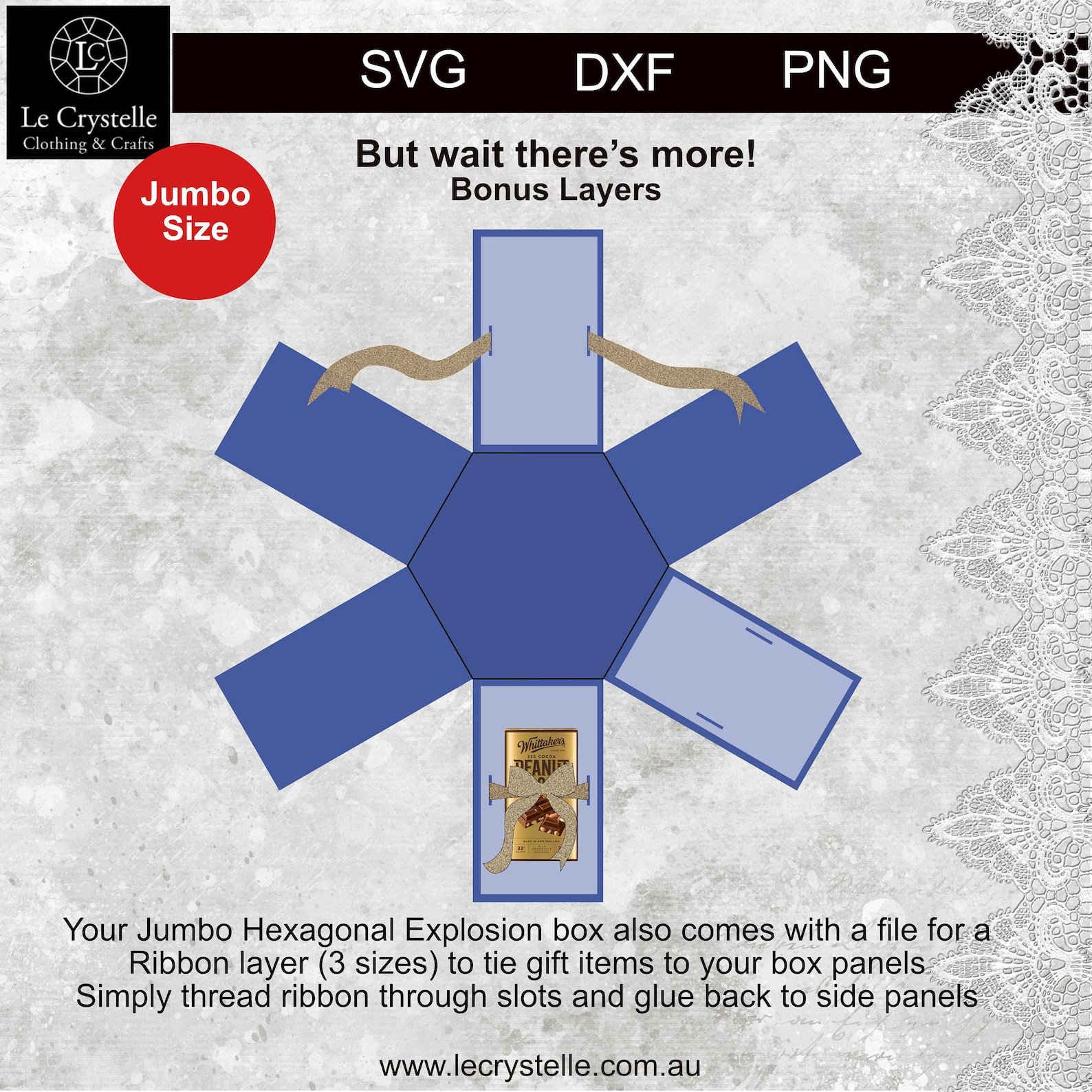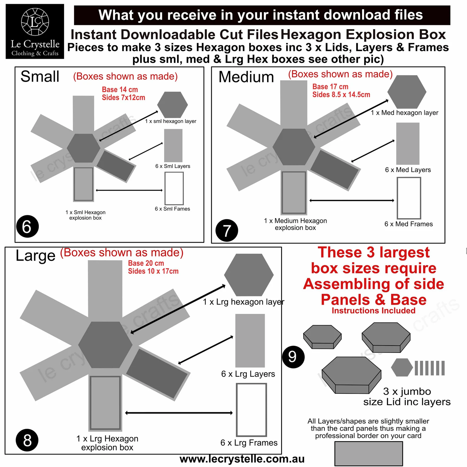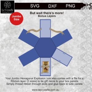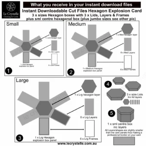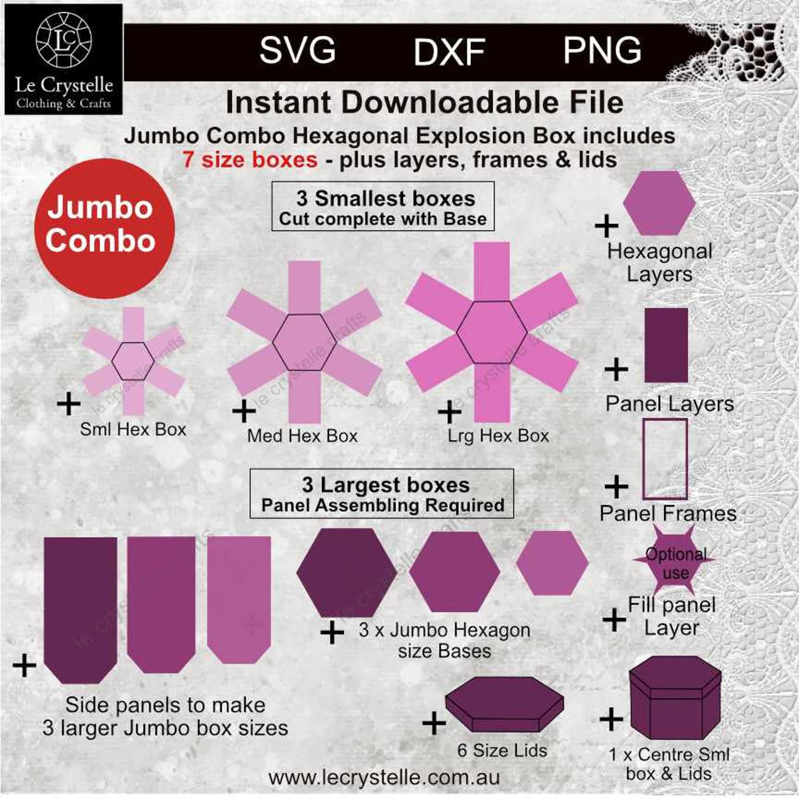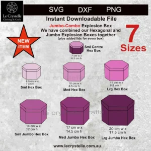 This is a Cut file for JUMBO-COMBO Hexagon Explosion Box – Largest assembled explosion box size is 20cm diameter and 17cm high and Smallest explosion box size is 8cm diameter and 7.5cm high, the smaller 7th layer being the center box is 6.5 diameter and 6 cm high