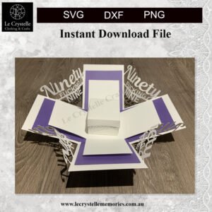 Your card cut file is not only for the 3 x box card sizes (1 x lrg 99 base, 1 x med plain square box, 1 x sml plain square box) with lrg lid and a small center box with lid and lace but you also receive files that contain square layers, decorative layers, frames, pockets and various shapes sentiments that are plain white and a second lot with themed quotes all in three sizes of small med and lrg. But wait there is more!…we also have included a Bonus plain standard lrg expl box that you can add with the med and small boxes to give you a standard square explosion box card. That is two styles for the price of one…There is so much more that our competition claim as extras that are given to you in our files. You won’t find better value anywhere.