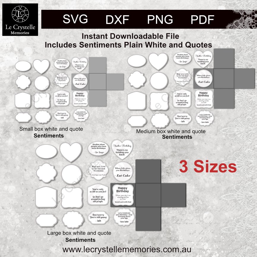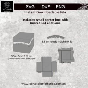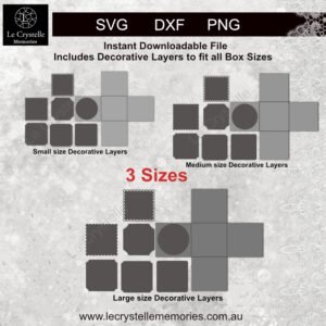 Your card cut file is not only for the 3 x box card sizes (1 x lrg 20 base, 1 x med plain square box, 1 x sml plain square box) with lrg lid and a small center box with lid and lace but you also receive files that contain square layers, decorative layers, frames, pockets and various shapes sentiments that are plain white and a second lot with themed quotes all in three sizes of small med and lrg. But wait there is more!…we also have included a Bonus plain standard lrg expl box that you can add with the med and small boxes to give you a standard square explosion box card. That is two styles for the price of one…There is so much more that our competition claim as extras that are given to you in our files. You won’t find better value anywhere.