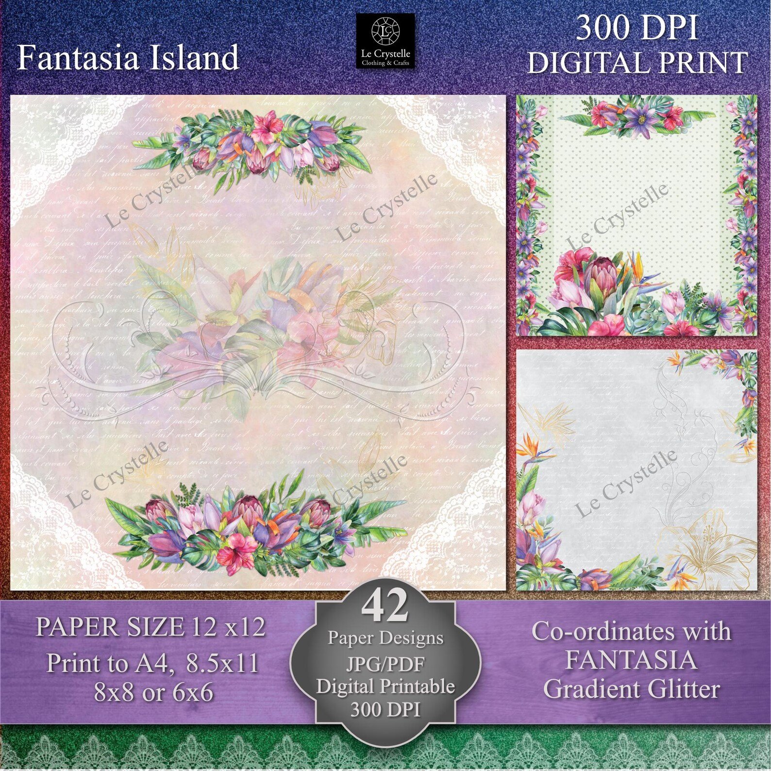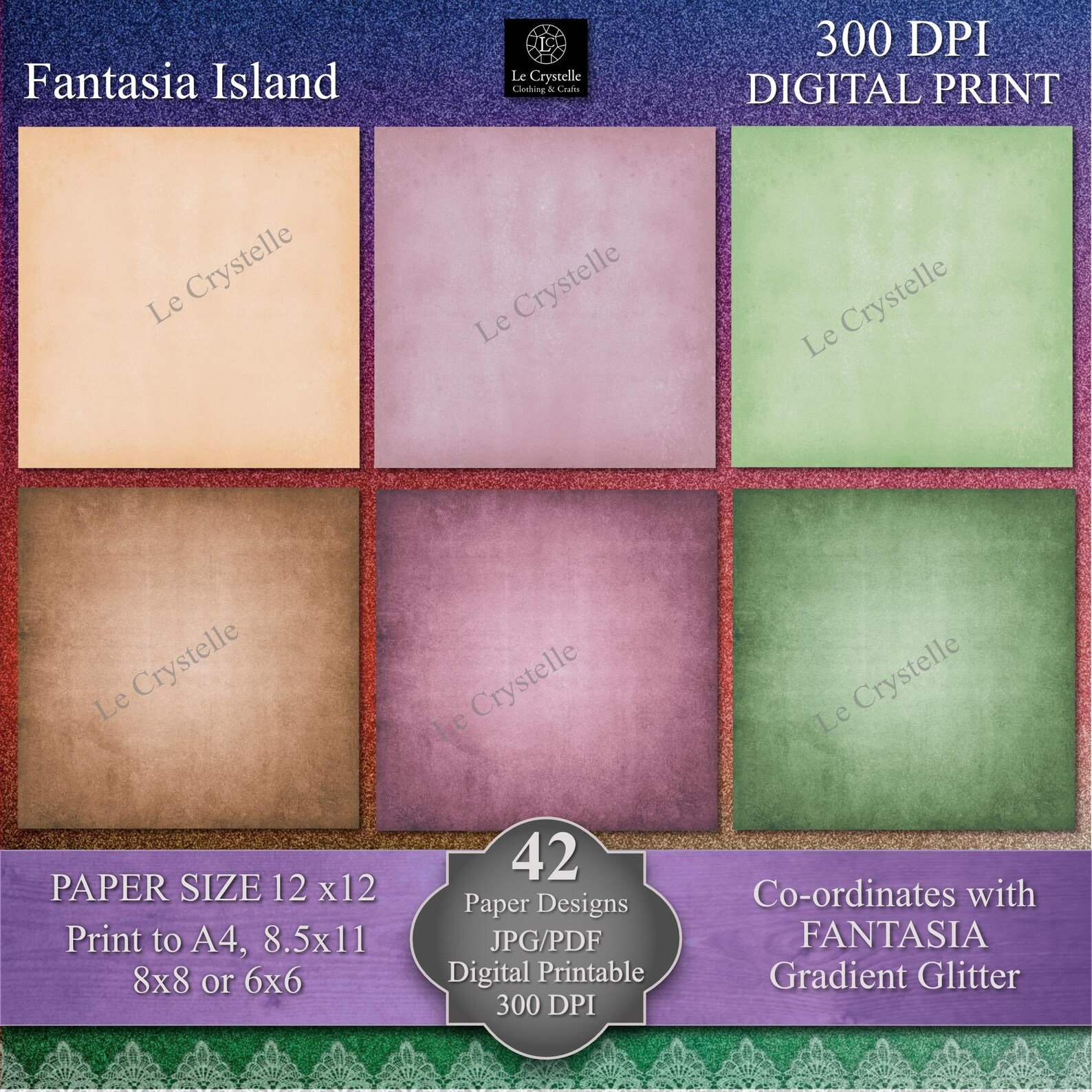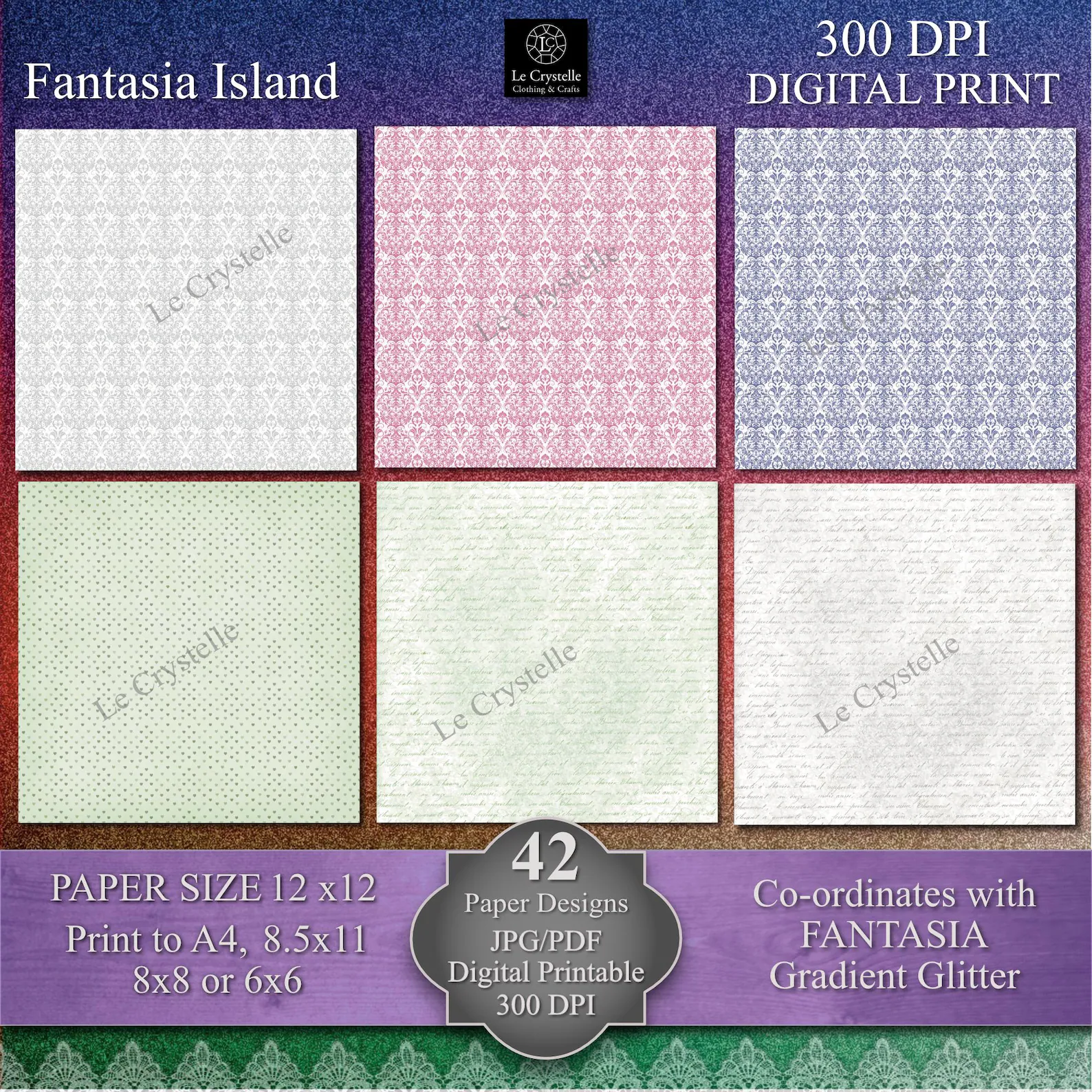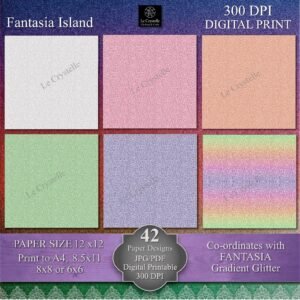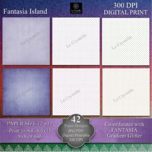 Elevate your crafting projects with this versatile collection of 42 coordinating Digital 12×12 designs, specifically created to complement our Fantasia Island ADD ON Background Collection, our Fantasia Island Floral Collection, our Fantasia Island Envelopes Tags and Embellishments sets. These 12×12 papers can be printed to A4, 8.5×11, 8×8 and 6×6 size. You need to know how to adjust your printer settings for the different size print outs.